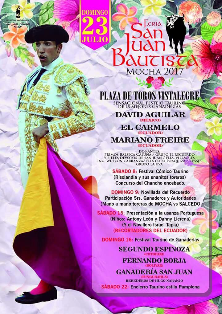 El torero mexicano David Aguilar, originario de Tehuacán, Puebla, toreará este domingo 23 de julio en la ciudad de Mocha, Ecuador en la plaza de toros Vistalegre para despachar un concurso de ganaderías junto a los ecuatorianos «El Carmelo» y Mariano Freire en el marco de la feria.
