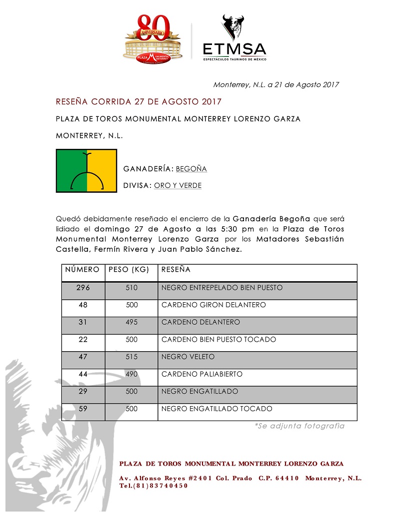 La Empresa de la Plaza Lorenzo Garza de Monterrey dio a conocer la reseña del encierro que será lidiado este domingo en un cartel internacional.