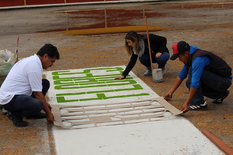 La obra del maestro artesano de arte efímero de Huamantla, Juan Hernández, con la leyenda “Fuerza Sergio”, fue gracias a la iniciativa de una joven aficionada taurina de Tlaxcala y amiga del joven diestro, Andrea Contreras Santamaria, quien, desde temprana hora, apoyando al maestro artesano, se pudo confeccionar un tapete artesanal que llamó la atención de propios y extraños que visitan de manera regular la plaza de toros.