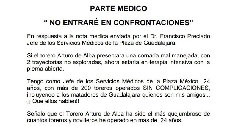 El jefe de los servicios médicos de la Plaza México, Rafael Vázquez Bayod, hizo circular un boletín en el que asegura que no caerá en confrontaciones, luego de operar al diestro tapatío Arturo de Alba, quien fue herido el pasado fin de semana mientras actuaba en una fiesta privada.