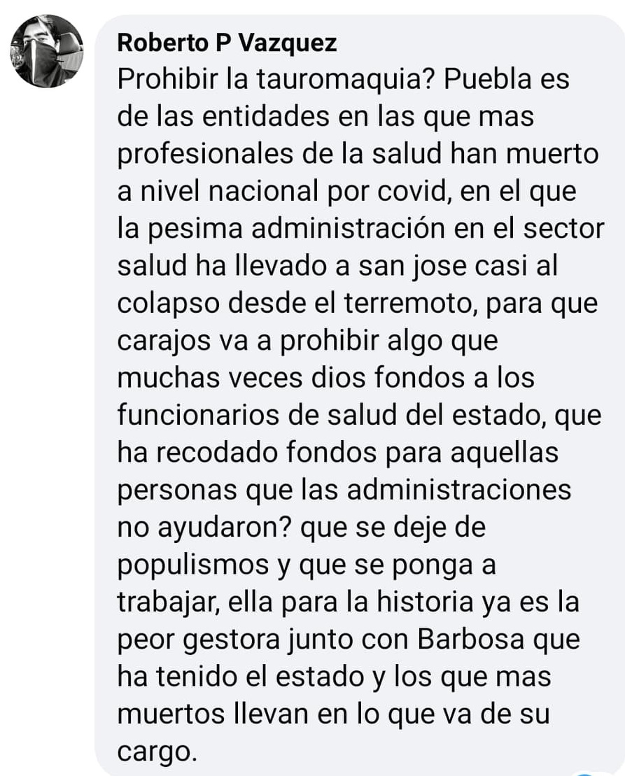 La prohibición de la tauromaquia en Puebla es un pretexto además de político, para la comercialización de artículos antitaurinos y fondeo de organizaciones de la sociedad civil ‘Puebla Viva y sin Corridas de Toros’, que junto con otros políticos oportunistas y de poca monta, quieren confundir a las nuevas generaciones con respecto a la tauromaquia.