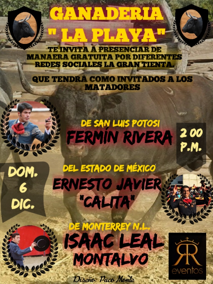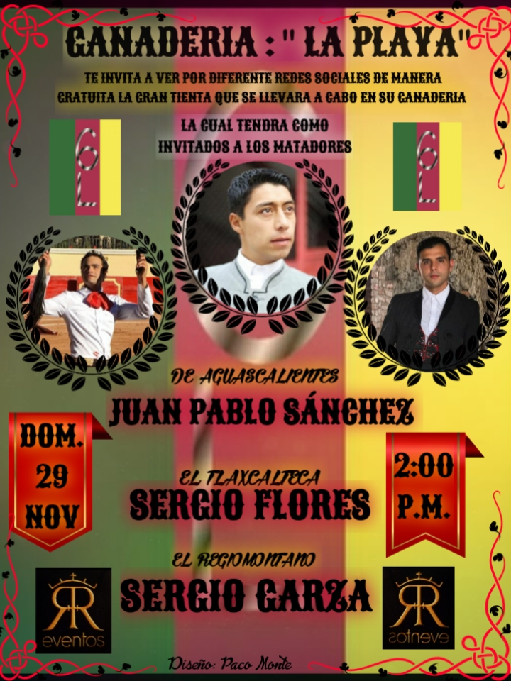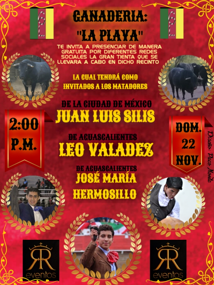 Desde el estado de Nuevo León se informa que el diestro en retiro Raúl Rocha “El Duende”, después del éxito que tuvo el pasado 25 de octubre en la tienta en la ganadería de Dos Ríos, ahora se ha dedicado a organizar cinco tientas más en la ganadería norteña de La Playa, casa de la divisa en verde, guinda y amarillo, propiedad de los sucesores de doña Bertha Domínguez, ubicada en el municipio neoleonés de Lampazos de Naranjo.