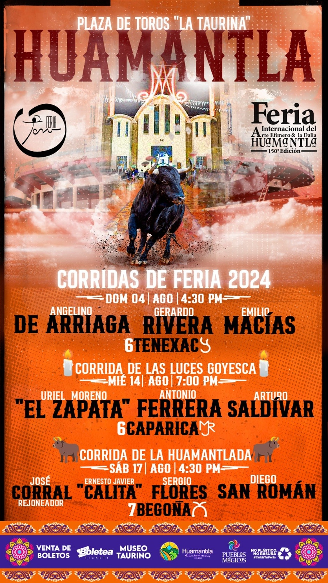 SÁBADO 17: A las 16:30 horas. Acostumbrada Corrida de la Huamantlada. Siete toros de la ganadería guanajuatense de Begoña para el rejoneador queretano José Corral y, a pie, los espadas, el mexiquense Ernesto Javier “Calita”, el de casa Sergio Flores y el queretano Diego San Román.