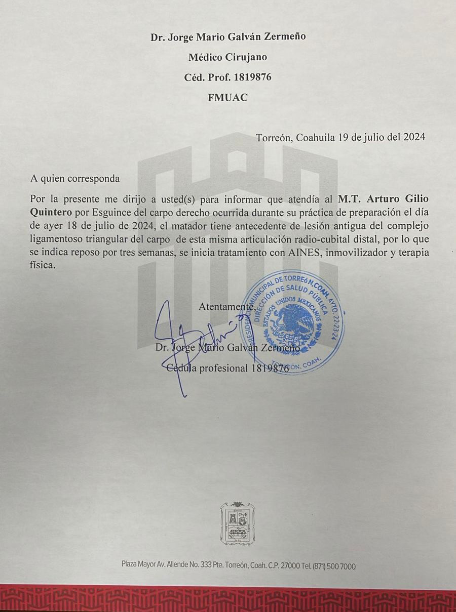 Por ello, la mañana de este viernes 19, a primera hora, le fueron realizados estudios por el equipo médico del doctor Jorge Mario Galván Zermeño, por lo que emitió el informe especializado correspondiente, en el que se le recomienda al matador tres semanas de reposo antes de la rehabilitación.