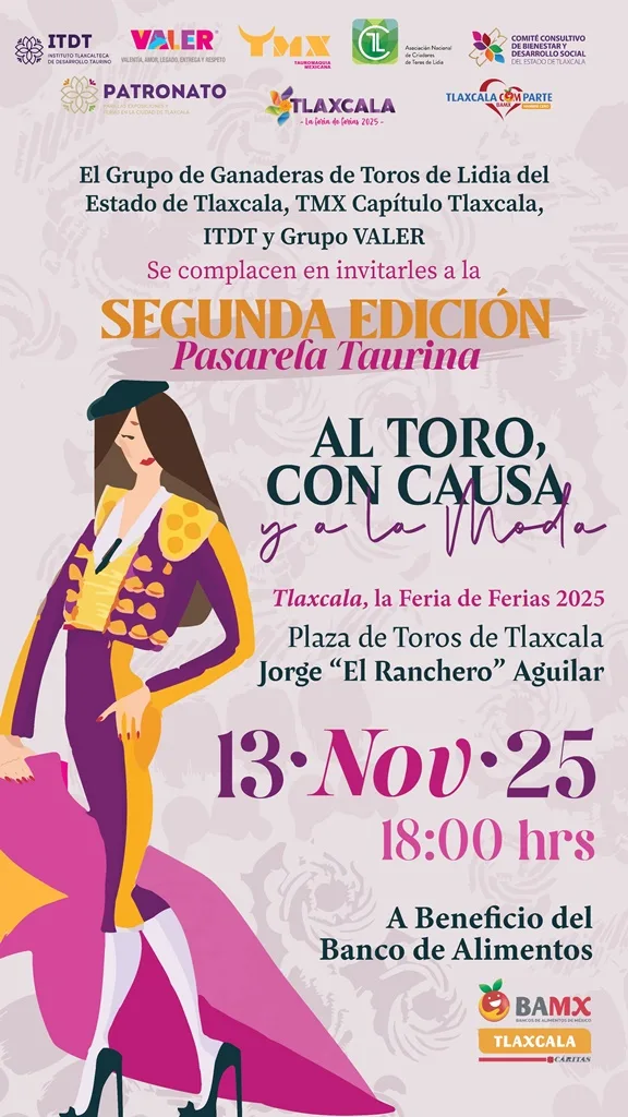 Además de los anterior, se llevará a cabo la II edición de la “Pasarela al Toro con Causa y a la Moda” el jueves 13 de noviembre, a las 18:00 horas, en el coso “Jorge ‘Ranchero’ Aguilar”, evento organizado por el grupo Ganaderas de Toros de Lidia del Estado de Tlaxcala con apoyo de Tauromaquia Mexicana, Capítulo Tlaxcala y grupo VALER, siendo el único con costo y lo recaudado será donado al Banco de Alimentos.