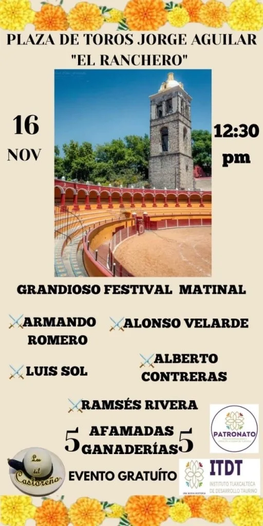Así que, se han montado siete festivales taurinos en el coso “Jorge ‘Ranchero’ Aguilar” para el viernes 24, domingo 26 y viernes 31 de octubre, viernes 7, viernes 14 y domingo 16 de noviembre, con la particularidad de que el 16 habrá un festival a medio día y otro por la tarde.